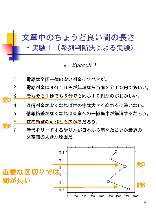 段落の区切りにあたる「間3」および「間6」で、間の最適時間長は長くなっています。